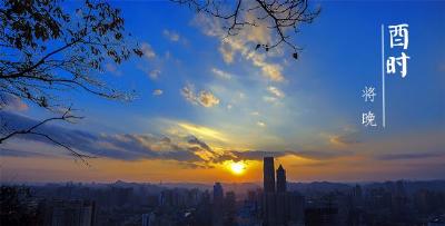【酉时】日入,又名日落、日沉、傍晚:意为太阳落山的时候。(下午 5 时正至下午 7 时正)。这段时间鸡开始归巢。